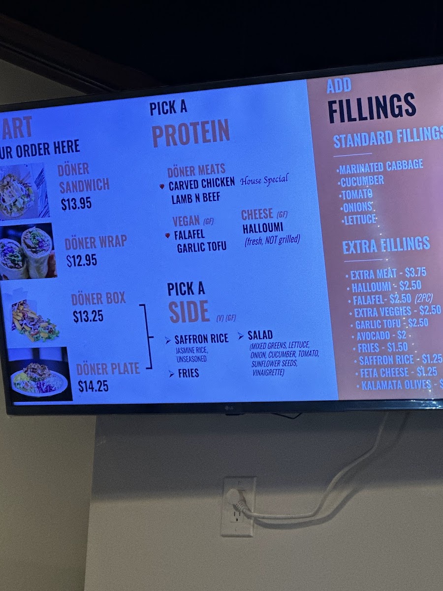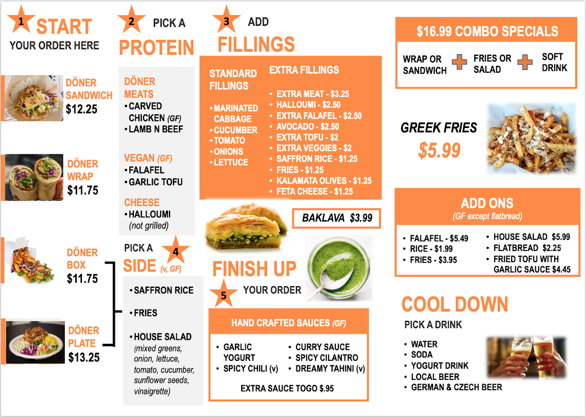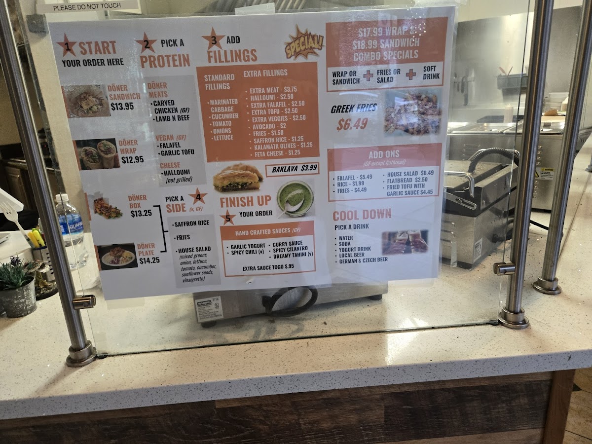 The menu at Doner Box is designed to satisfy even the most discerning palates, featuring a variety of mouthwatering options. You simply can't go wrong with their signature Doner Box ($16.50) — a delightful assembly of tender, flavorful meats accompanied by fresh veggies and sauces, all served in a convenient box for your enjoyment. If you're in the mood for something handheld, dive into their Doner Wrap ($16.20) or the hearty Doner Sandwich ($17.20) that bursts with flavors in every bite. Also, don’t miss out on their unique Combo Specials ($22.95) that come with a refreshing soft drink and a side of fries or salad — perfect for a quick yet satisfying meal.