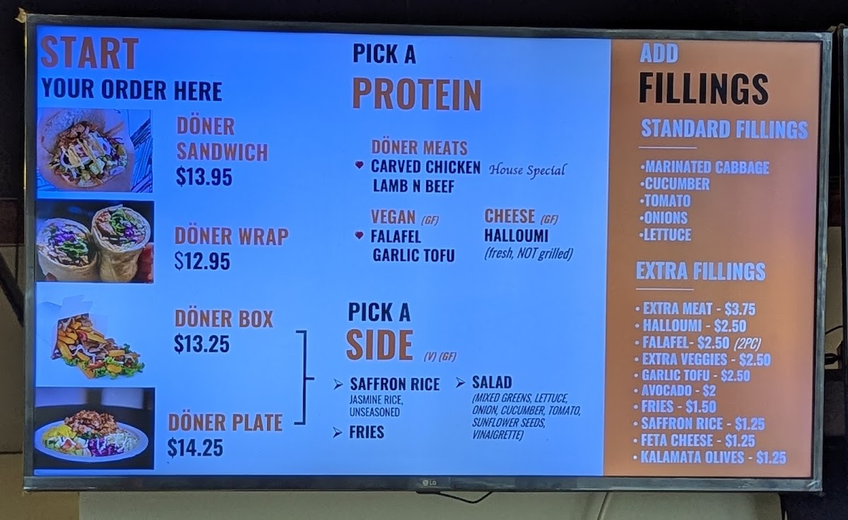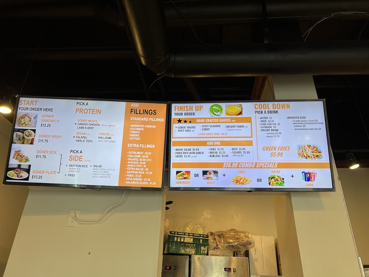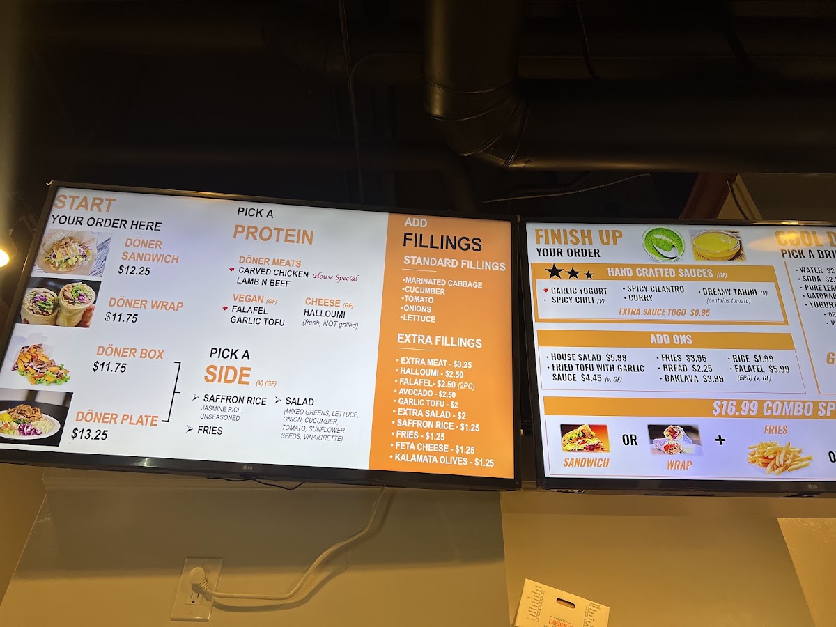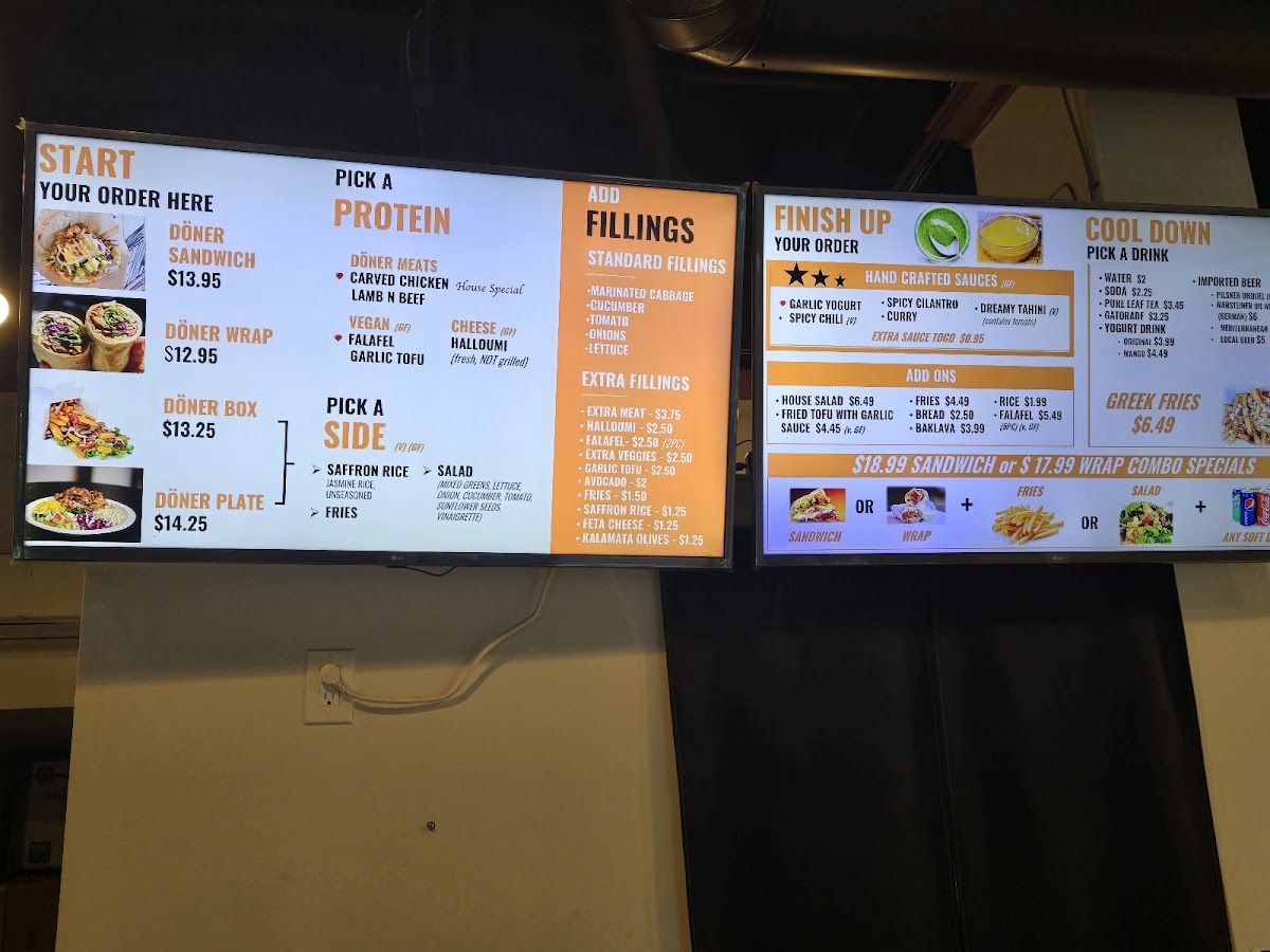 The menu at Doner Box is designed to satisfy even the most discerning palates, featuring a variety of mouthwatering options. You simply can't go wrong with their signature Doner Box ($16.50) — a delightful assembly of tender, flavorful meats accompanied by fresh veggies and sauces, all served in a convenient box for your enjoyment. If you're in the mood for something handheld, dive into their Doner Wrap ($16.20) or the hearty Doner Sandwich ($17.20) that bursts with flavors in every bite. Also, don’t miss out on their unique Combo Specials ($22.95) that come with a refreshing soft drink and a side of fries or salad — perfect for a quick yet satisfying meal.