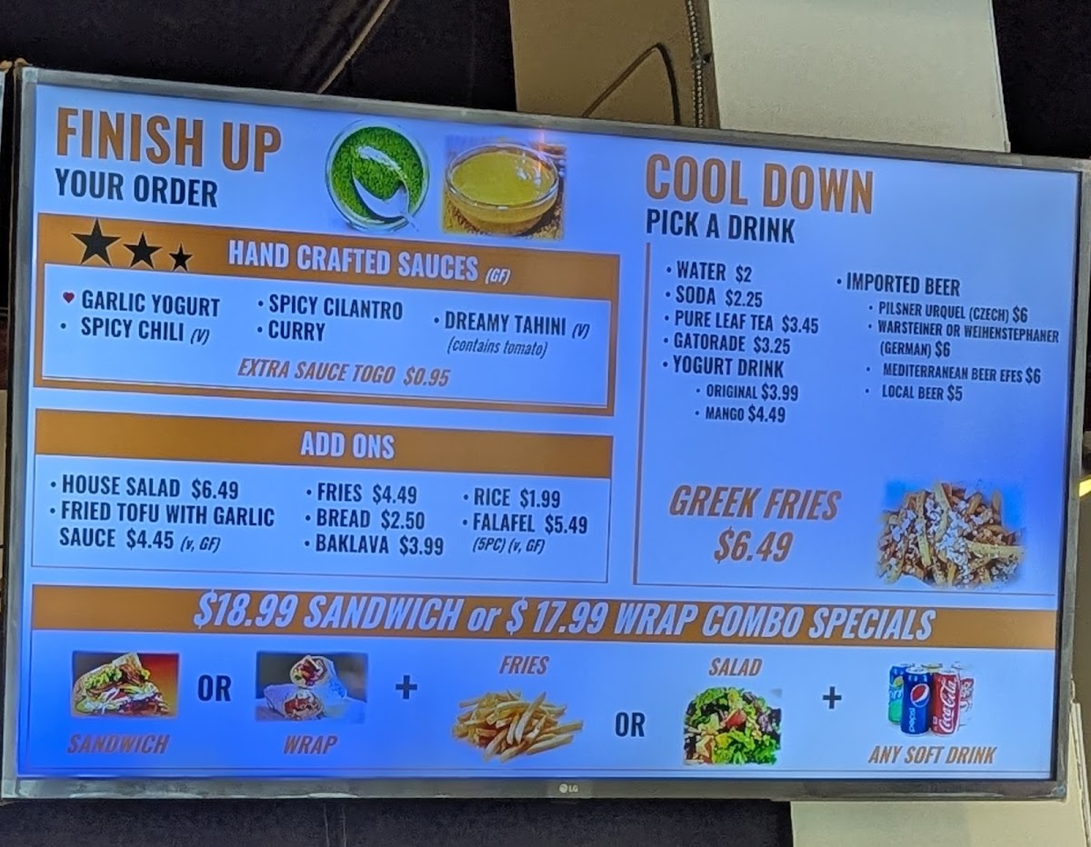 For those who fancy lighter fare or delightful accompaniments, the Falafel ($6.25), made from scratch and served with a delectable dipping sauce, is a must-try. Pair it with a side of Greek Fries ($6.95) drizzled with a garlic yogurt sauce for a flavor explosion!